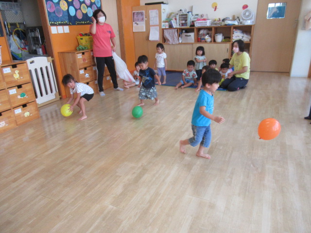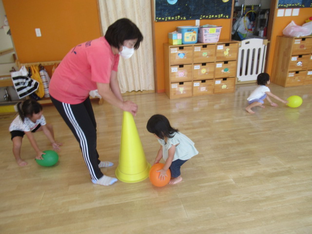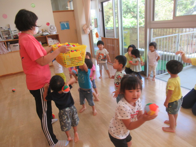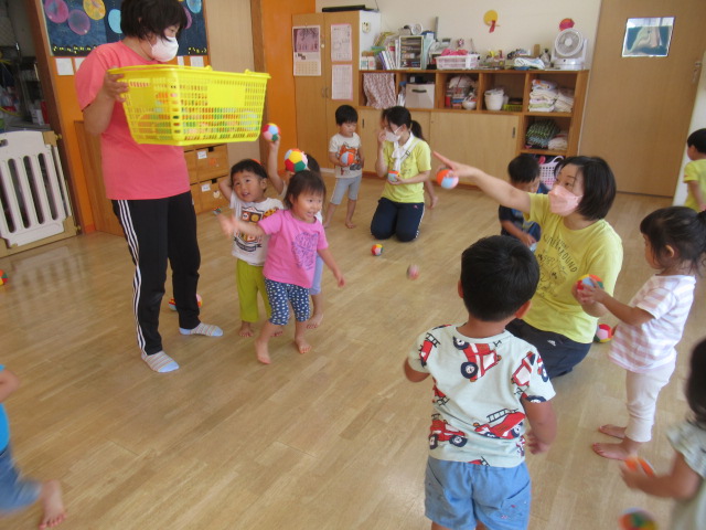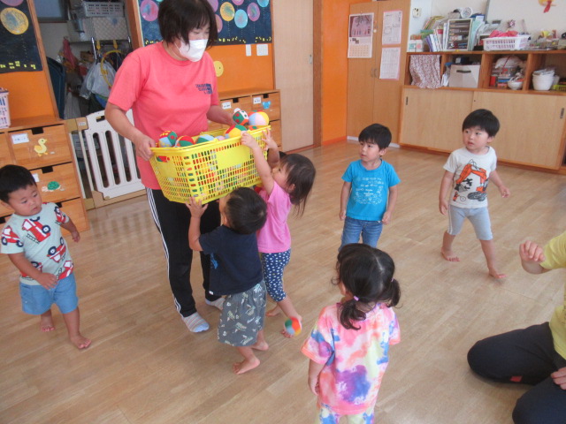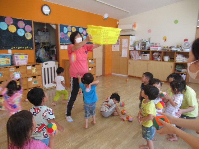 プログラム1番は『玉入れ』です。低い位置のカゴから高い位置のカゴへ段々と入れるのが難しくなっても へっちゃら!上から投げたり下から投げたりと工夫しながらぜ〜んぶ玉をカゴへ入れることが出来ました^_^
