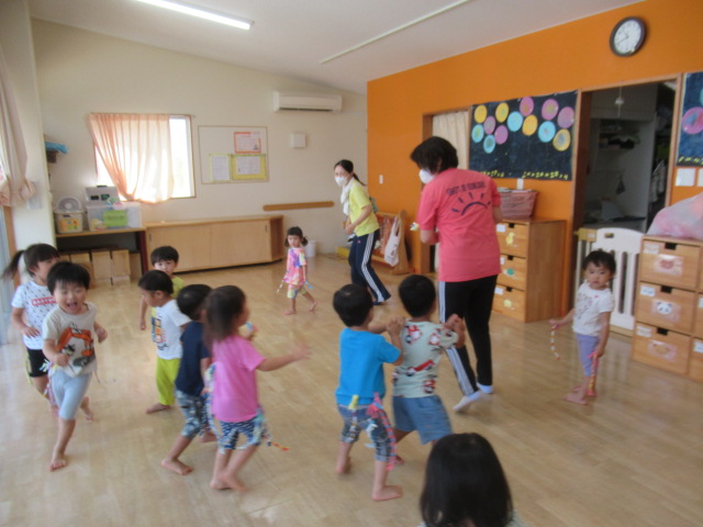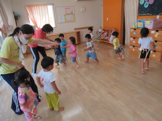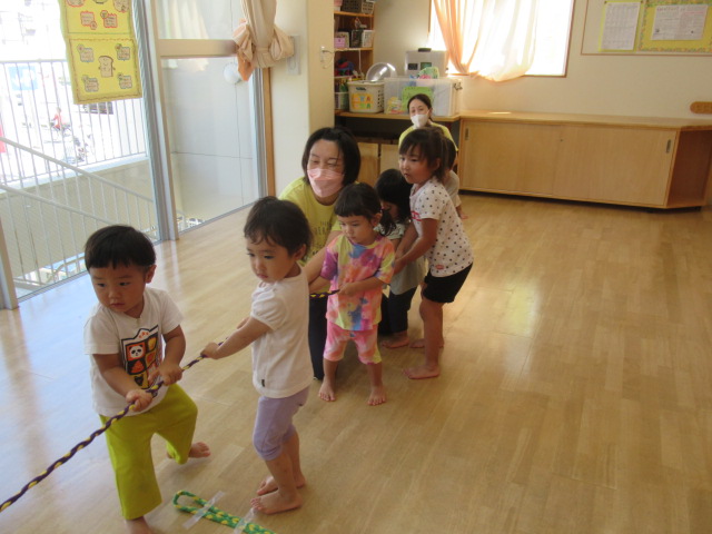 最後はみんなで『しっぽ取り』をしました。保育士のしっぽばかりを狙って取る子、ただ走り回るのが楽しい子、取られたら怒る😤子、たくさん取って喜ぶ子と様々な姿がありました。