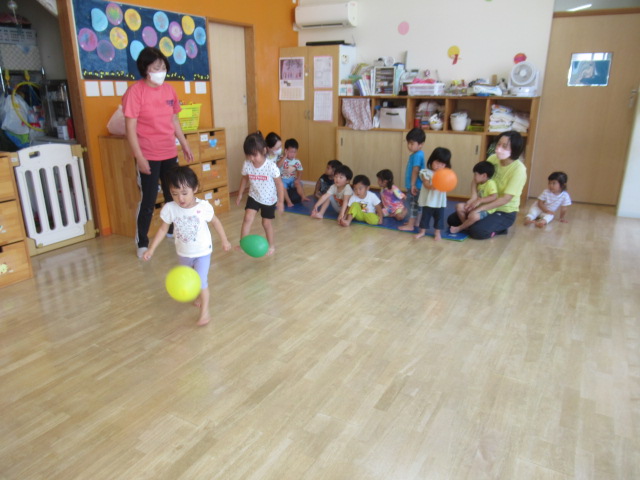 プログラム3番は『風船転がし』です。先にある三角コーンを目指してあっちにこっちにと転がる風船🎈を蹴ってゴール。中々思い通りに進まずに途中から手に持って走って帰るお友だちもいましたよ ^_^ 早くゴールしなくっちゃ!と気持ちが先走っちゃったけど楽しそうにゴールイン‼︎一生懸命に頑張りました。