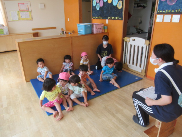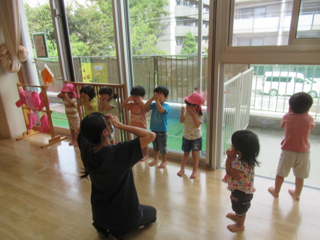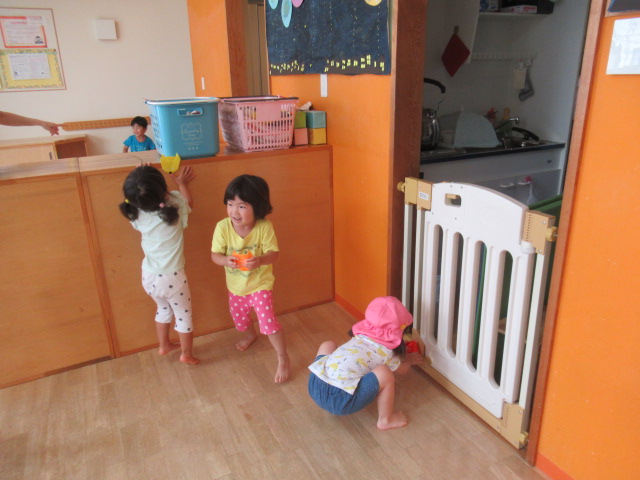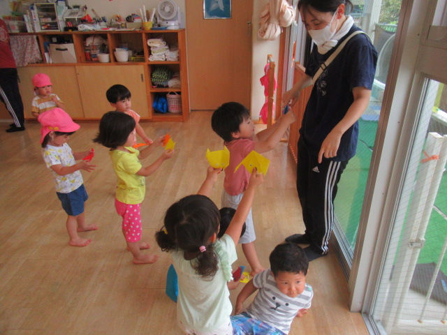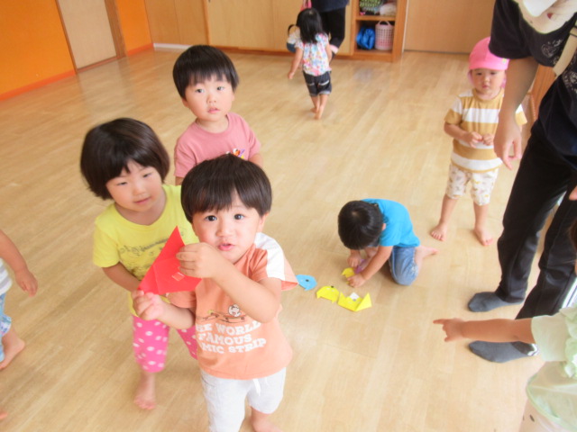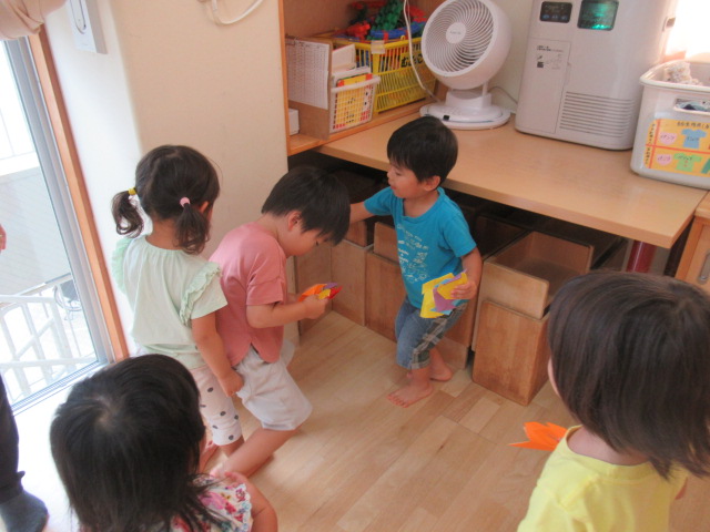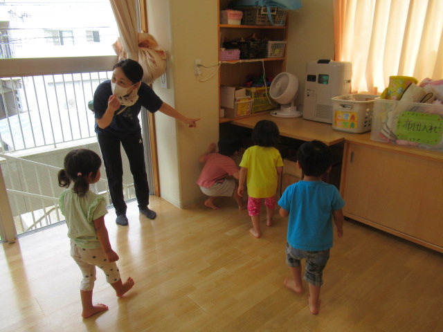 折り紙の動物が部屋のあちこちにかくれんぼしているのを、みんなに探してもらいました。動物たちがかくれんぼしている間、みんなは顔をかくして10まで数を数えました。寝転んで数えているお友達もいましたよ!それから、みんなで一緒に動物たちを探します。見つけた時は嬉しそうに「あったー!!」と教えてくれました。たくさん見つけたお友達、頑張ったけど見つけられなかったお友達と様々でしたが、一生懸命に探している姿は、まるで小さな探検家でした😊