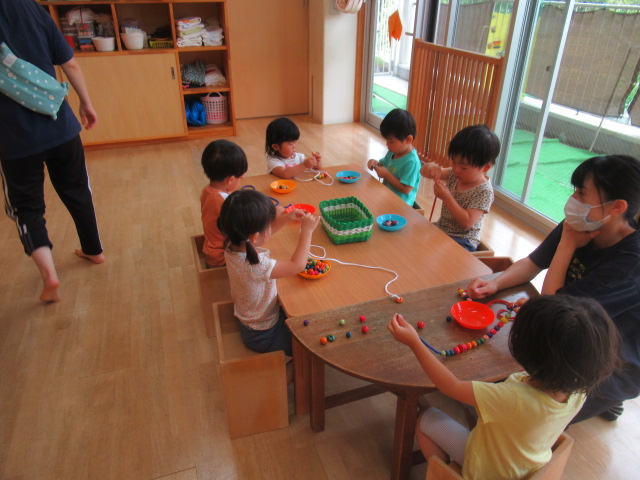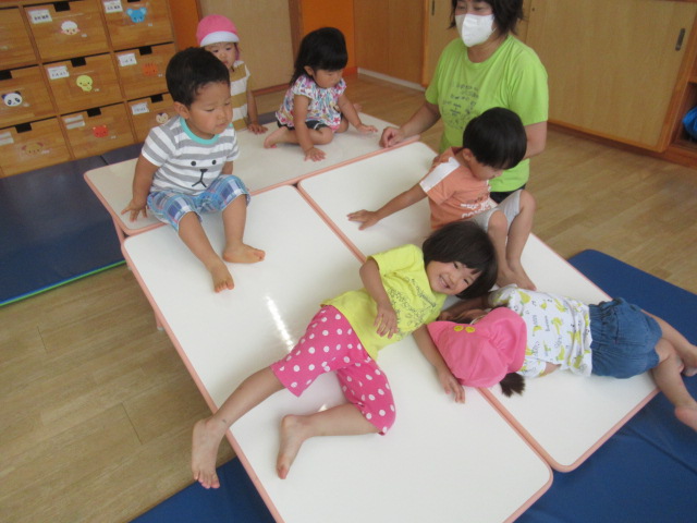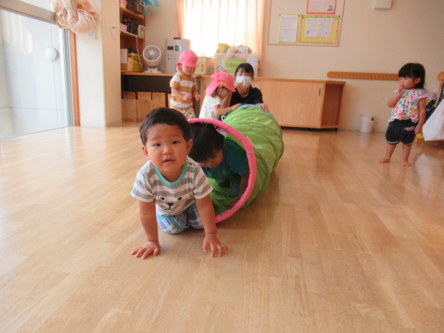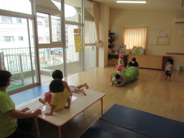 部屋にすべり台とトンネルを設置してどんぐり公園のできあがり😆トンネルもすべり台も順番を守り、お友達とぶつからないように気をつけてね、と声をかけながら見守りました。遊びたい気持ちが勝って順番が待てなかったり、反対から登ったりと色んな姿がありましたが、周りのお友達の姿を見て学んだり気付いたりする事もたくさんあります。そういう事を簡単なルールのある遊びの中で体験し、ルールを守って楽しく遊ぶ経験を積み重ねていきたいと思います。