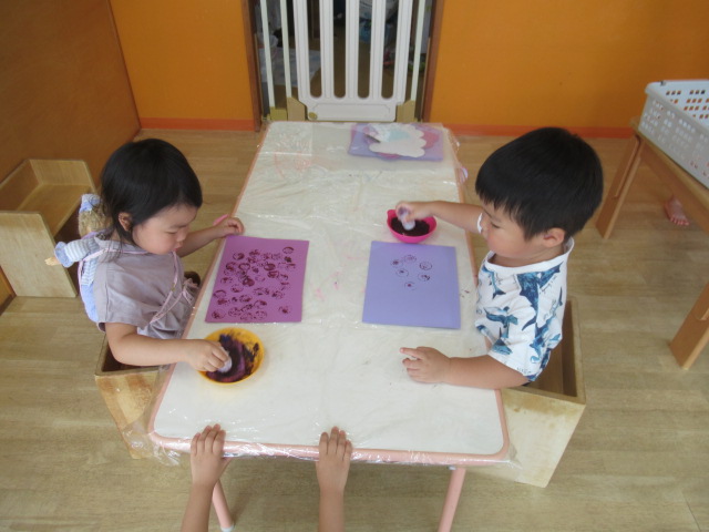 9月の壁面制作では、ペットボトルキャップのハンコでぶどうを作っています。紫色の絵の具をつけて画用紙にペッタン。完成したら壁面に飾りますのでお楽しみに♪