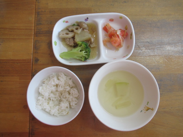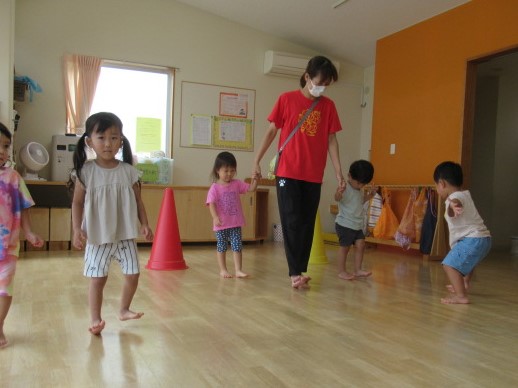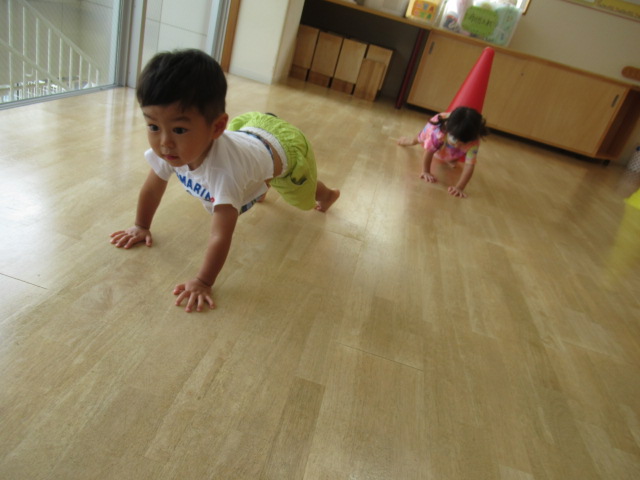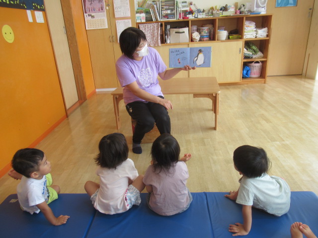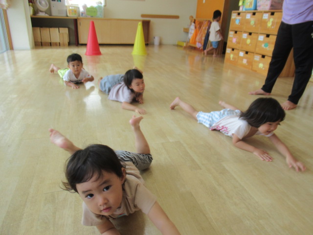 絵本『どうぶつまねっこたいそう』を読みました。ノッシノッシと膝を付けずにお尻を上げて歩く熊や、かかとで歩くペンギン、お腹は床につけたままズーリズーリと歩くのはワニ。他にもカニやカエルなど。まずは、保育士が1つだけ特徴を伝えてやって見せると、子どもたちはとっても上手に真似っこしていましたよ♪ 最初は、やりたくないと言っていた子も他の子が楽しそうにしているのを見て自分もやってみよう!と真似してみたり、みんなから褒められると出来た!と喜ぶ姿もたくさん見られました。遊びの中で身体だけでなく心も成長してくれたらいいなと思って楽しんでいます。