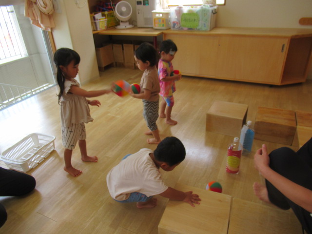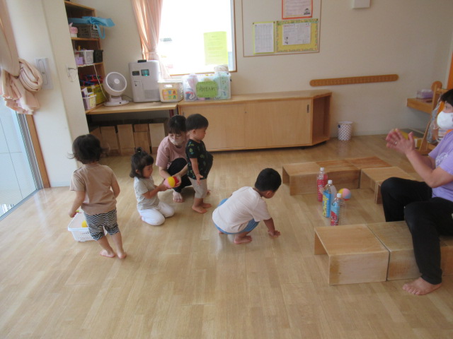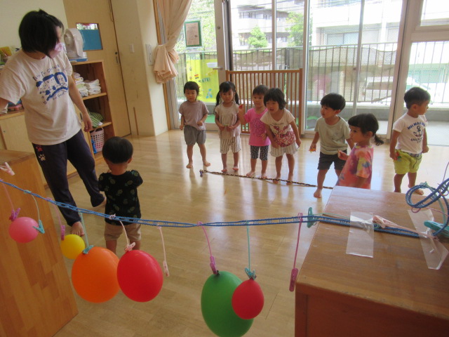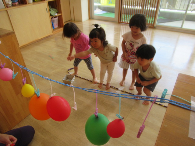 ふわふわとぶら下がる風船🎈を的に折り紙の手裏剣で当てっこするコーナーとボウリングコーナーを作って好きな所で遊びました。なかなか当たらずに段々と前へ前へと迫ってくる子どもたち^_^最後には当たって大喜びでした♪
