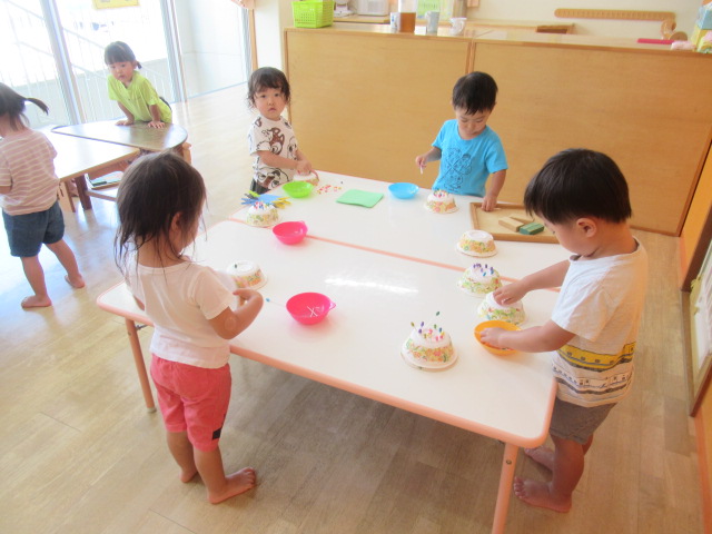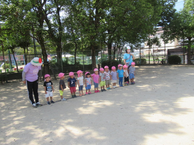 少し遠回りをして公園に行ってきました。広ーいグランドの陰の下で、まずは玉入れ遊び!赤と白の玉を分けて入れるルールを説明してスタート!最初はうっかり間違って「ちがうよ~」と伝えると「あっ💦」と照れながらやり直す子どもたち。繰り返していく内にすぐに赤はあっち!白はこっち!と素早く入れて「出来た!」と喜んでました。お友達とぶつからない様に自然と動けているのも集団で過ごしている中で身に付いた力ですね。次は電車ごっこ!長ーい紐を電車に見立ててぐるっと一回り。みんなの歩幅に合わせないと小さなお友だちがこけてしまいます。急ぎたい気持ちもありますが、みんなでゆっくり歌を歌いながら「ポッポー!!」と回る事が出来ました。最後はヨーイドン!紐の上にみんな一列に上手に並ぶ事が出来てビックリ!!「ヨーイドン!」の掛け声に、待ってる保育士の所に飛び込んでました!「もう一回!!」と何度も走って楽しみました^_^笑顔で走る子どもたちの姿がとっても可愛かったです。たくさん遊んで保育園に帰りました。温水シャワーをしてスッキリしました。