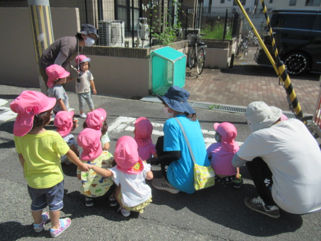 猫ちゃん今日もいるかな~と楽しみに出かけていきました。けれど、残念…今日は会えませんでした。「猫ちゃんいないね、お散歩に行ったのかな?」と子どもたちに聞いてみると「お家に帰っちゃったんだよ」等々思ったことをそれぞれに言ってくれました。緑色のレモンがなっている木も見つけました。黄色くておいしいレモンになるように魔法をかけました。歩いているといろんな音が聞こえてきます。飛行機の音、草むらから聞こえる虫の声等々。何の音かな?と耳を澄ましてみたり、おしゃべりしながら歩きました。日差しはまだまだ暑いですが吹く風は気持ち良く、お散歩に丁度良い季節です。お家でもお子さんと一緒に手をつないでブラブラ散歩を楽しんでくださいね。