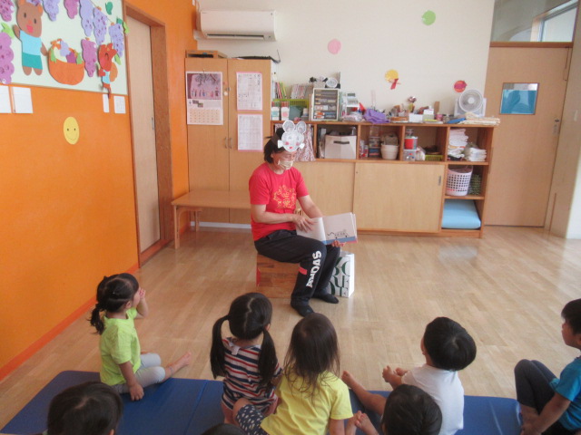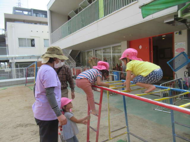 お集まりで「バスに乗って」という絵本を読んだので、うさぎバスに乗って園庭へ出発!園庭ではそれぞれ好きな遊具を選んで、ごっこ遊びが自然と始まりました。「先生はここに座って下さーい!」「お茶ですよー」「これはカップケーキですー」とあちらこちらから聞こえてきました。
