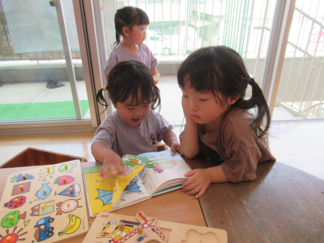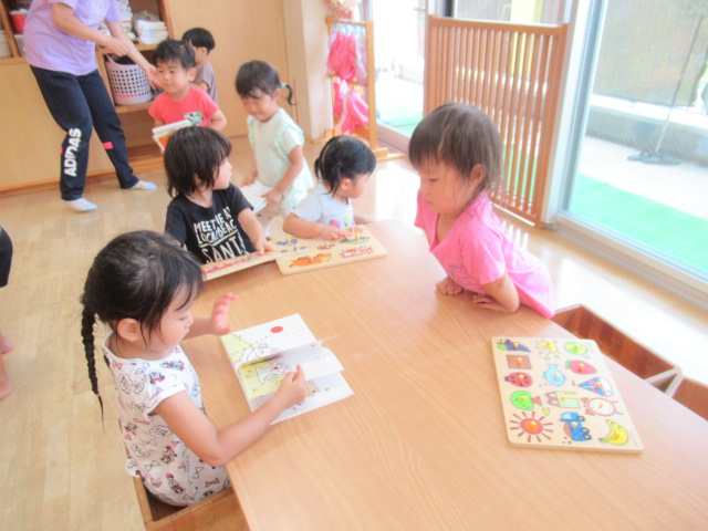 今日も暑かったのでシャワーで汗を流してスッキリしました。スッキリした後は給食の時間までホッコリ絵本やパズルで遊びました^_^
