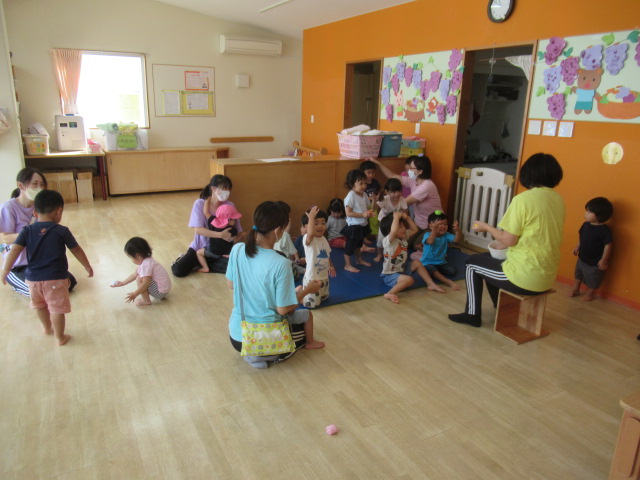今日は秋の歌「どんぐりころころ」「まつぼっくり」「トンボのメガネ」や子ども達からのリクエストで「カエルの歌」「カタツムリ」の歌をうたいました。知ってる歌があると嬉しそうでしたよ!絵本は「おいもさんと」を読みました。