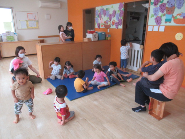 「どんぐりころころ」の歌をうたって「どんぐりコロちゃん」の絵本を読みました。身体を左右に揺らしながら歌ったり聞いてくれていましたよ。