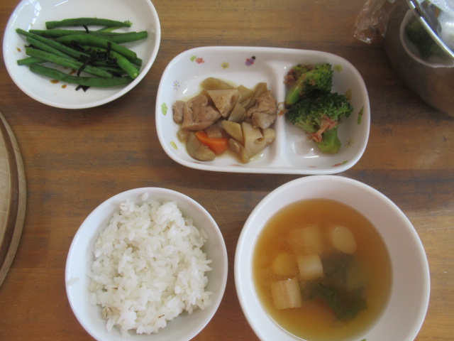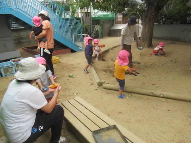 散歩から帰った後は園庭で遊びました。砂場ではカキ氷屋さんやチュルチュル屋さん、お味噌汁屋さんなどなど色んなお店がたくさん賑わいました。広場では、ボールを追いかけたり蹴ったりして遊んでいました。雲梯も大人気でした。