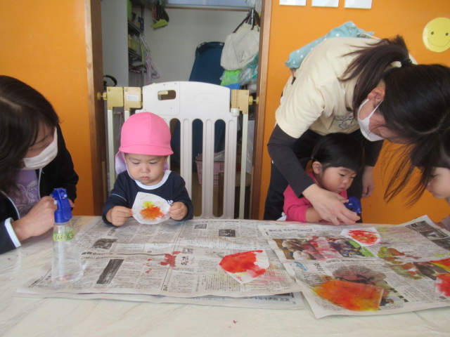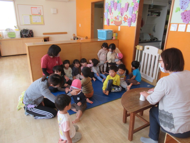 紙コップの中にウサギやカエル、犬の指人形を入れておき、カップを順番に開けていくと、何が出てくるかな?!とソワソワ見ていた子どもたちです。