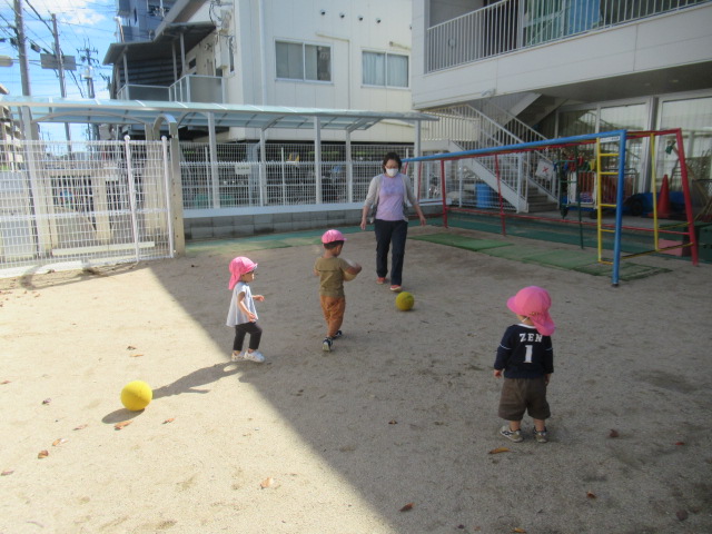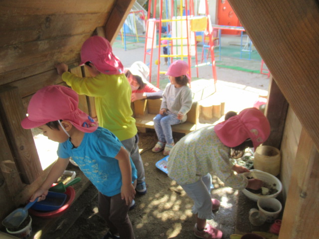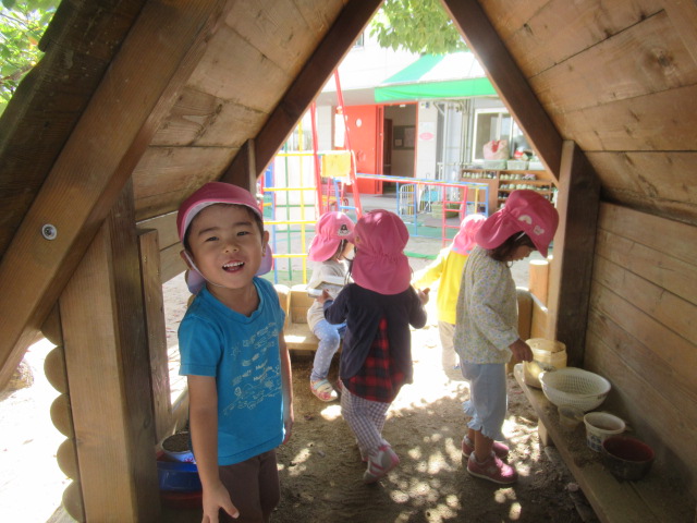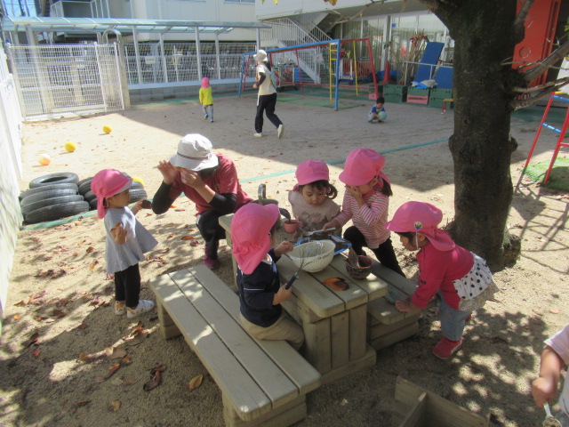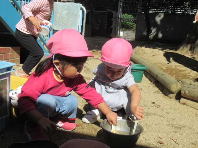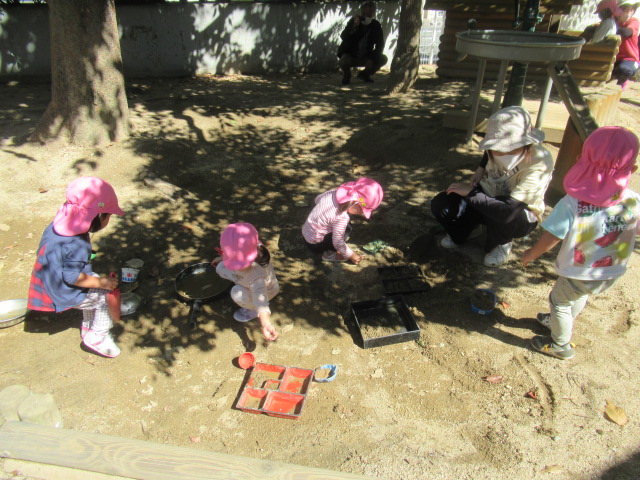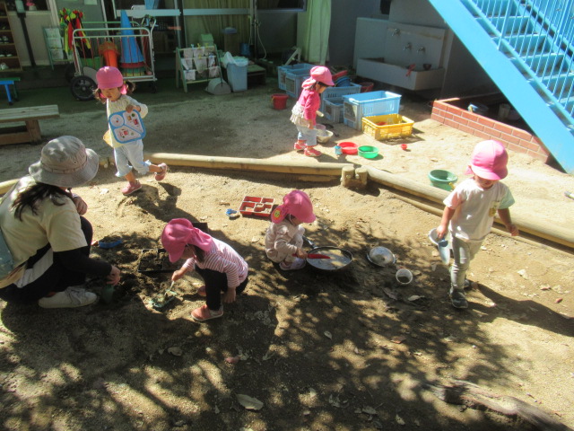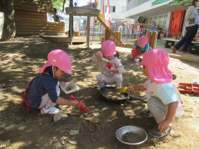 お外に出て遊びました。桜の葉っぱを拾い集めておままごとに使うお友だちがいると、周りの子も集めだしていて微笑ましかったです。