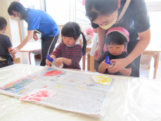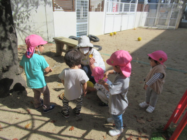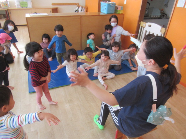 トンボになって「とんぼのめがね」を歌いました。羽を広げるように腕をピッと横に伸ばしてトンボが飛んでいるみたいに真似っ子が上手などんぐりさんでした😊