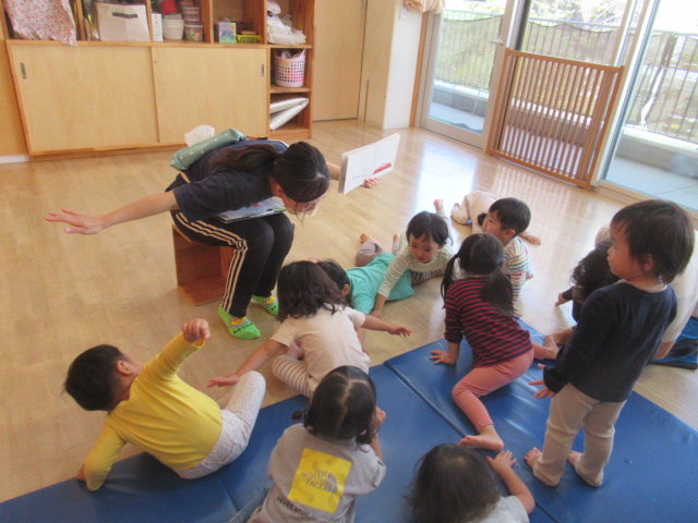 子ども達が大好きなだるまさんシリーズの「だるまさんが」を読むと、みんなだるまさんになりきって、ドテッとこけたり、プシューっとぺったんこになったり😊最後のにこっと笑顔になるところでは、みんな笑顔になって心がポカポカになりました😊