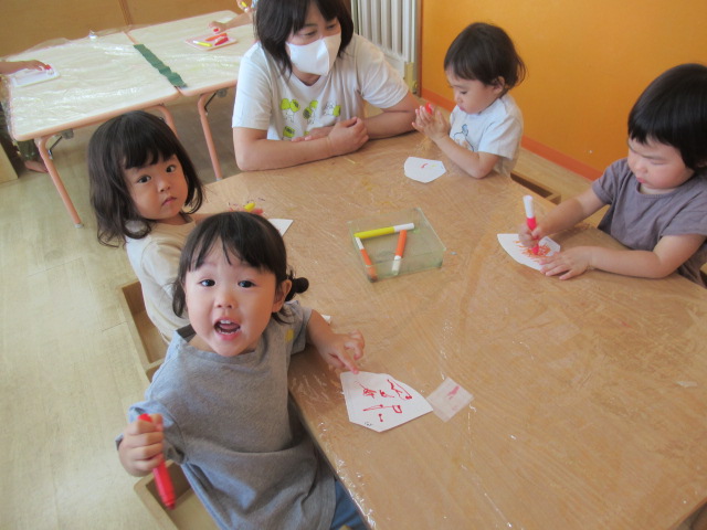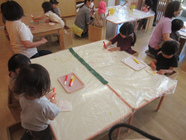 今月の壁面制作はトンボを作っています。コーヒーフィルターにペンでお絵描きして水を散らすと、にじんでとてもきれいな模様になります。出来上がりを楽しみにしていてくださいね。