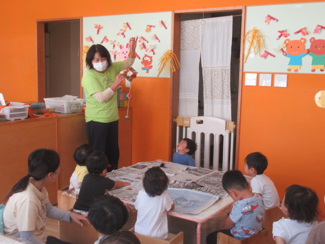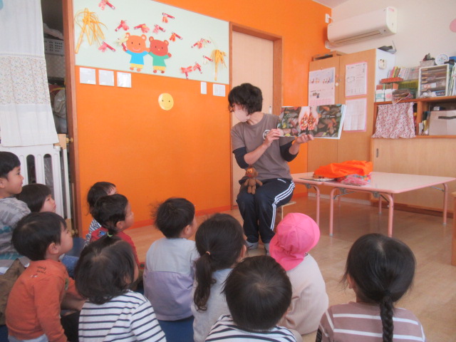 どんぐりの実写の絵本を読みました。みんなも何度か散歩で探しに行ったことがあるので写真を見ると「見たことがある!」と目をまん丸にして見ていましたよ。知ってる!見たことある!経験した事と繋がると嬉しいですね。