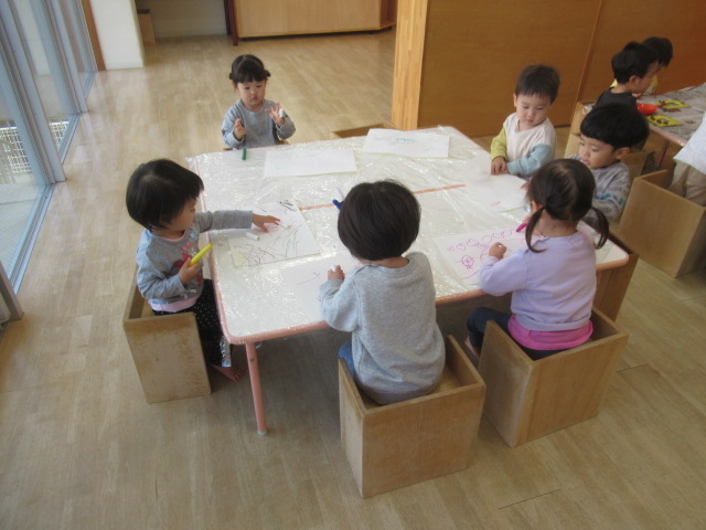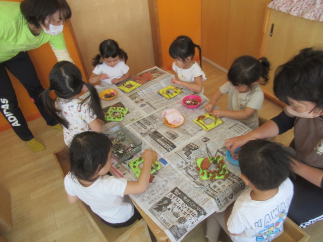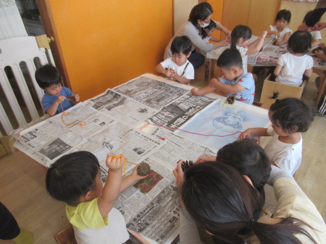 こんな物を作ろうと思うんだけど、どぉ?と見せると「やりたい!やりたい!」台紙の上に好きな色のボンドを塗ってもらいその上に枝や色んなサイズや形のどんぐりや葉っぱを乗せていきます。それぞれこんな風にしたい!という思いがあってこだわりのオーナメントが仕上がりましたよ^_^ 乾いてみんなのが出来上がりましたら壁面で飾りますのでお楽しみに!!