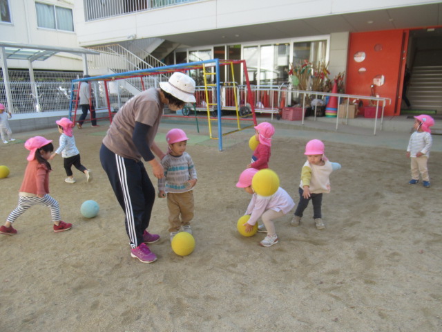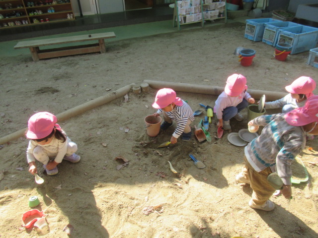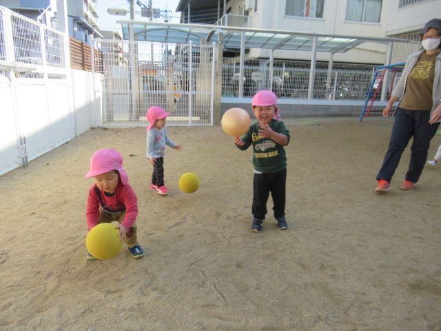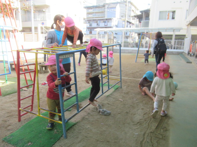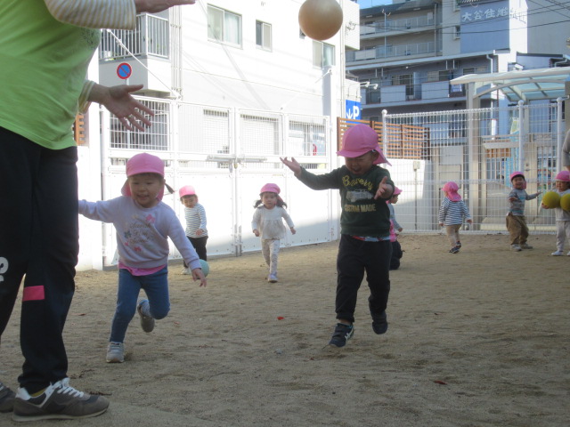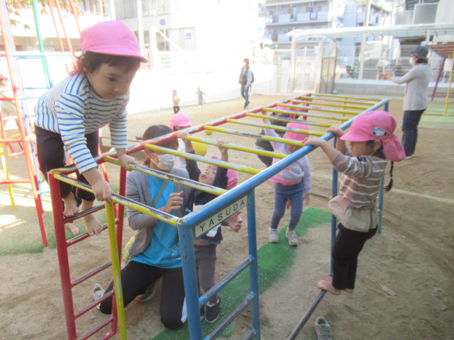 園庭ではボール遊びも自由に出来るのでそれが楽しみな子どもたちも沢山!ボールをそれぞれが手にして一気に「ポーイ!」と投げるので受ける私たちは走り回っています(笑)それを見て喜ぶ子どもたち💦(笑) 雲梯も年齢にあった高さのものがあるので子どもたちもこの高さならやってみよう!と思えるようです。やってみよう!やってみたい!そんな気持ちを大事にしたいですね。砂場では保育園の年長さんも遊んでいて、その輪の中に入って遊んでもらったりたっぷり遊んで給食を食べました^_^