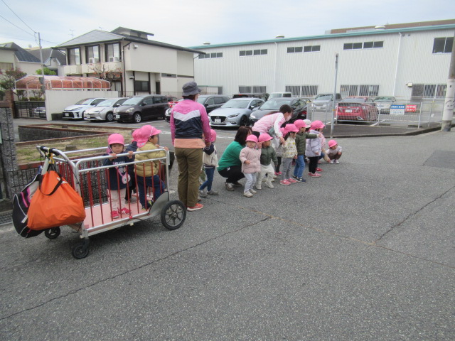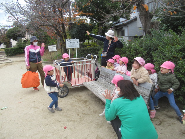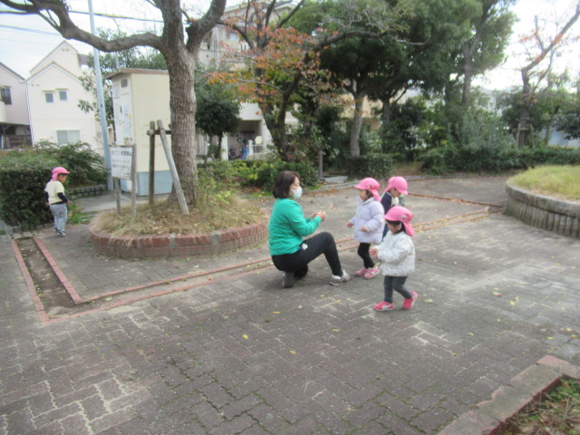 公園に向かっている道中「あっ!絵本に出てきた猫や!」と見つけ、そーっと動く猫に合わせてみんなもそーっと歩み寄って逃げられないギリギリの所から腰を下ろして見ていました。「あっち行った!」「あそこにおるで!」とみんなに声を掛け合いながら可愛い姿でしたよ。