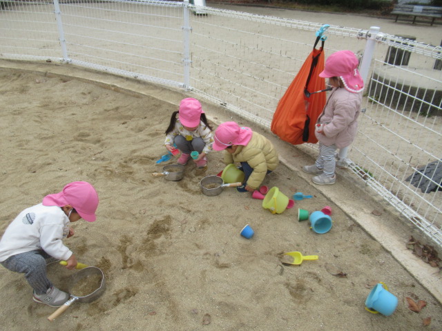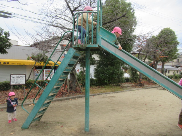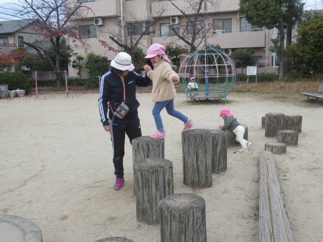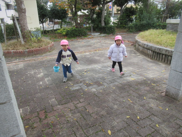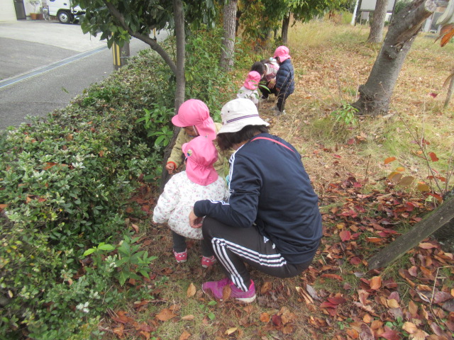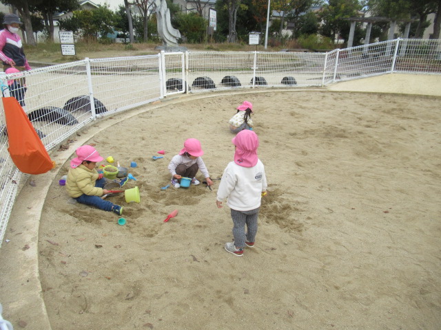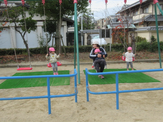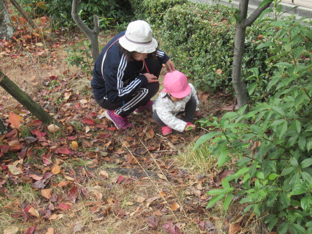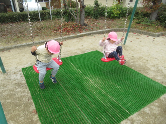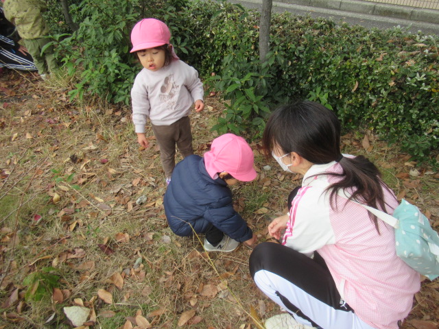 どんぐりの木にもまだまだどんぐりがたくさんあるので子どもたちは毎回楽しみにしています。葉っぱを掻き分けながら見つける事も覚えてたくさん集められました!こっちにもきっとあるよ!と保育士を誘って教えてくれたり、リードしてくれる子どもたちも増えました^_^ 滑り台や砂場でもじっくり遊んだり、新しくなったブランコが乗りやすくて喜んでいた子どもたちもたくさんいましたよ。