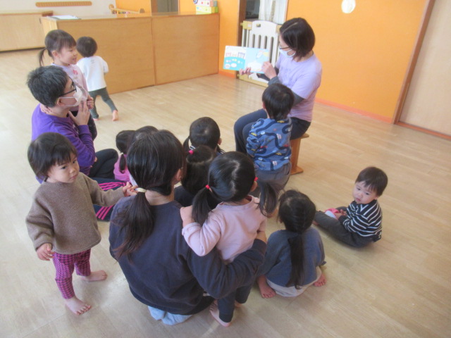 『クリスマスパーティーはじまるよ』というしかけ絵本を読みました。パーティーの準備でケーキを作ったり、チキンを焼いたりしているとサンタさんがおうちの中を覗いていたり、ワクワク感がいっぱいの絵本です。子どもたちは、「サンタさん知ってる~」「クリスマスツリー見たことある!」と口々にお話してくれました。クリスマスシーズンになってきていろんなところで見たり聞いたりしているのですね。