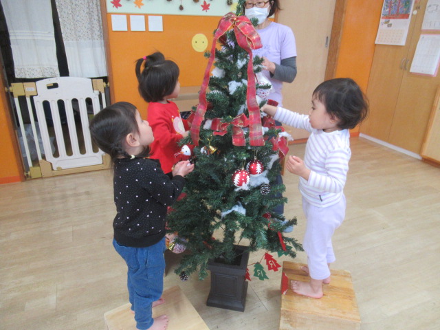 「階段を登って来たらツリー🎄があった!」と知らせてくれた子どもたち。どんぐりのお友だちにも一緒に手伝ってもらって飾りましたよ^_^