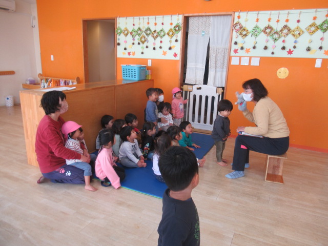 絵本『みんなでたのしいクリスマス』を読みました。クリスマスツリーを飾り、ご馳走やプレゼントをみんなで準備してクリスマスが来るのをワクワクしながら待っている楽しいお話です。どんぐりのみんなも「サンタさんにプレゼントお願いしたよ」と、とっても楽しみにしているようでした