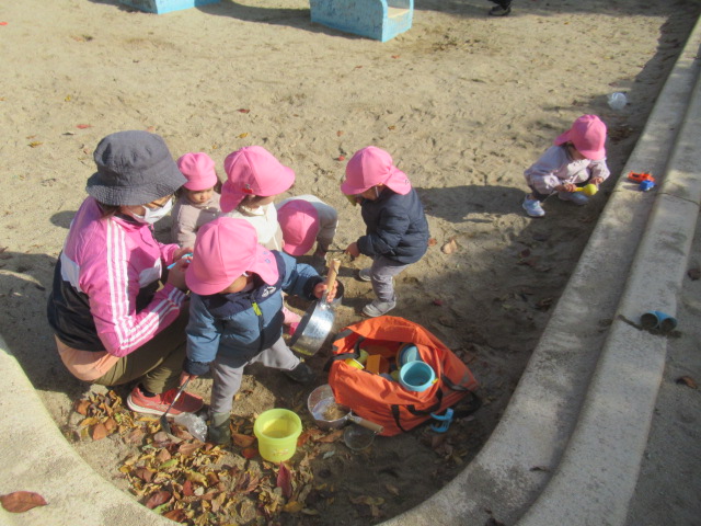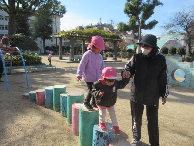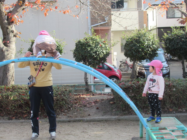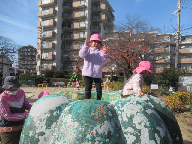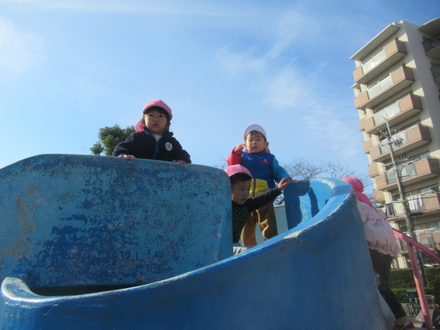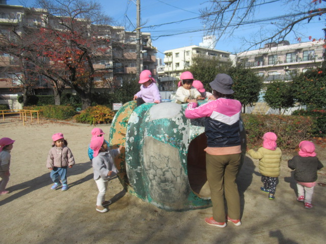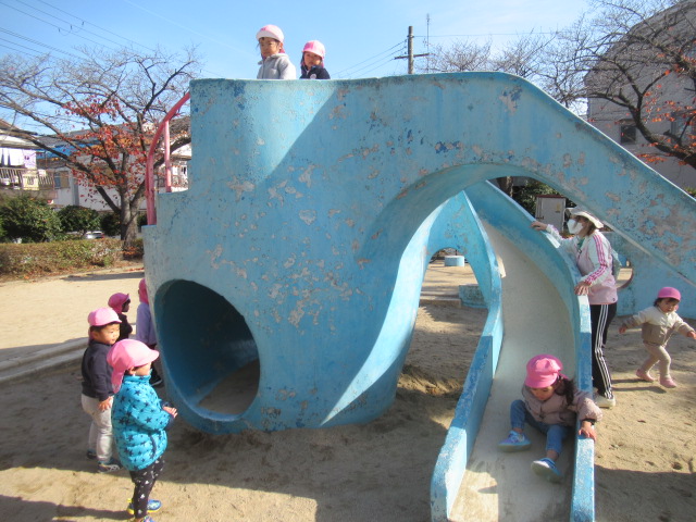 かぼちゃ公園へ遊びに行って来ました♪ とっても楽しい滑り台があって保育士やお友だちと一緒に何回も何回も滑って楽しんでいましたよ。お砂場やブランコ、太鼓橋にも挑戦しているお友だちもいてたっぷり遊んで来ました♪