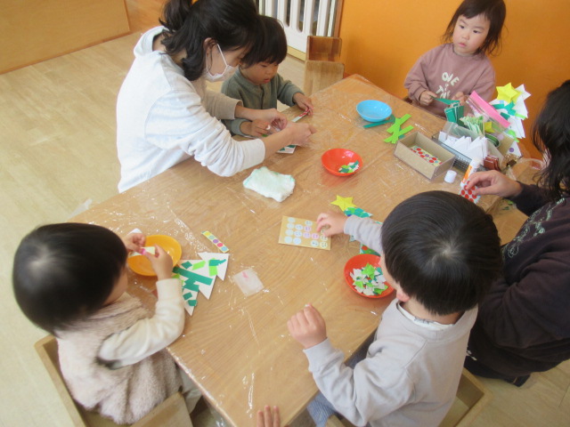12月の壁面製作しました。ちぎった折り紙をツリーの台紙に貼り、その上からシールを貼って飾りました。出来上がりを楽しみにしていてください😊