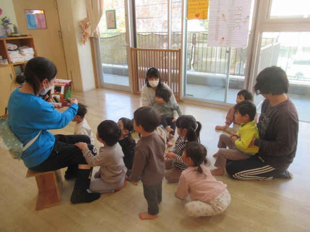 秋にうたった歌をたくさん覚えていて、今も子どもたちから「あれ歌いたい!」とリクエストがあります。今は「サンタのおじさん」「ゆきだるまのチャチャチャ」など、冬やクリスマスにちなんだうたを歌っています。知らない歌でも、体を揺らして聞いているどんぐりさん。みんな歌うのが大好きです♪