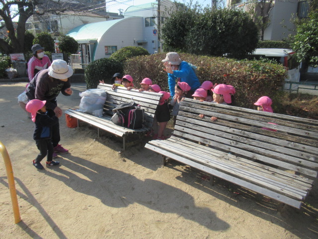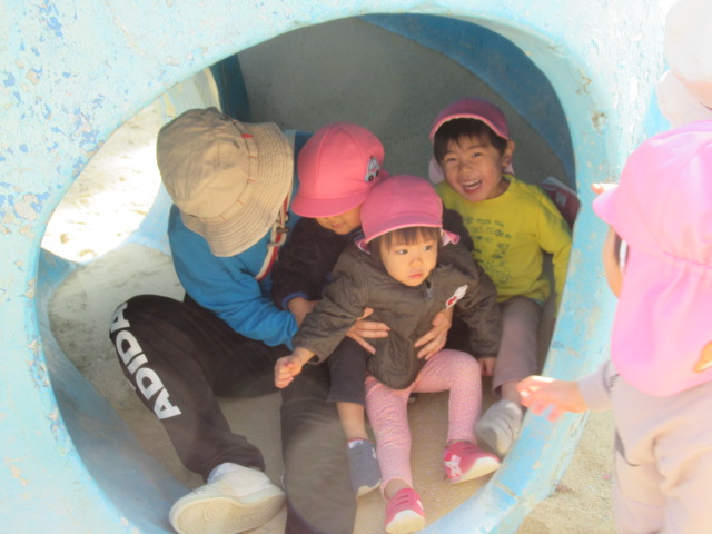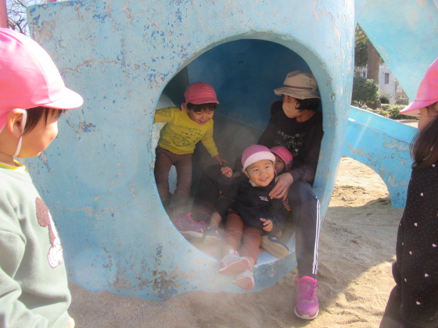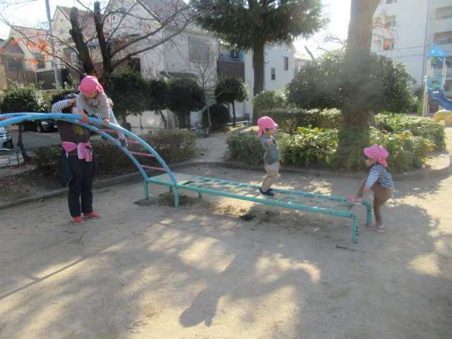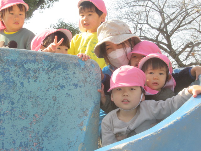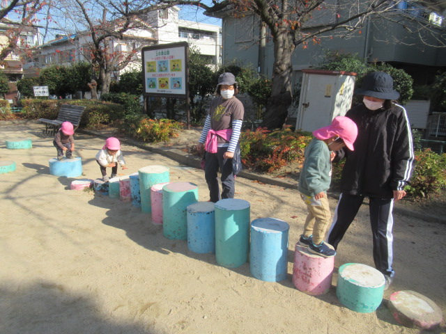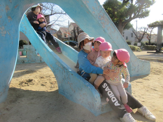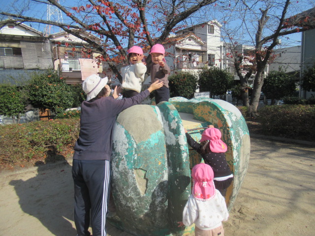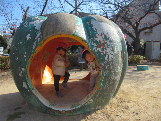 ジャンパーを着て公園へ行きましたが、着いた時には体がポカポカと温まっていたので、ジャンパーを脱いで遊ぶお友達もいました😊滑り台やかぼちゃの遊具に登って上から「おーい!先生ー!」と手を振っているお友達もいました😊