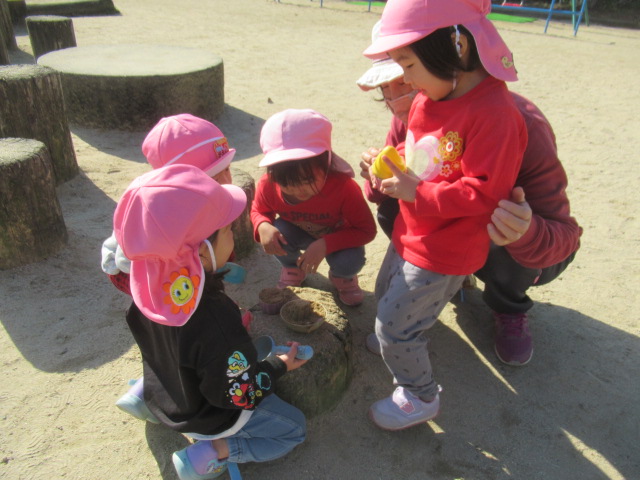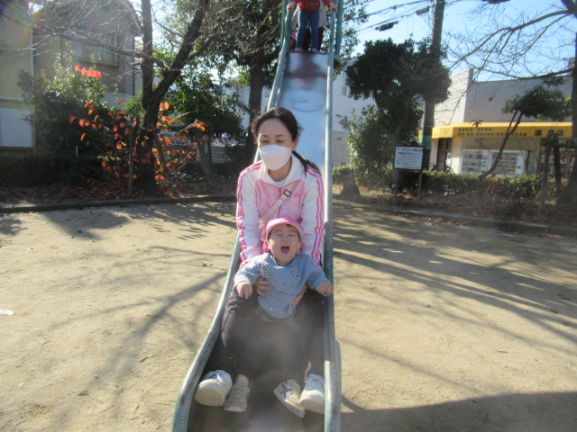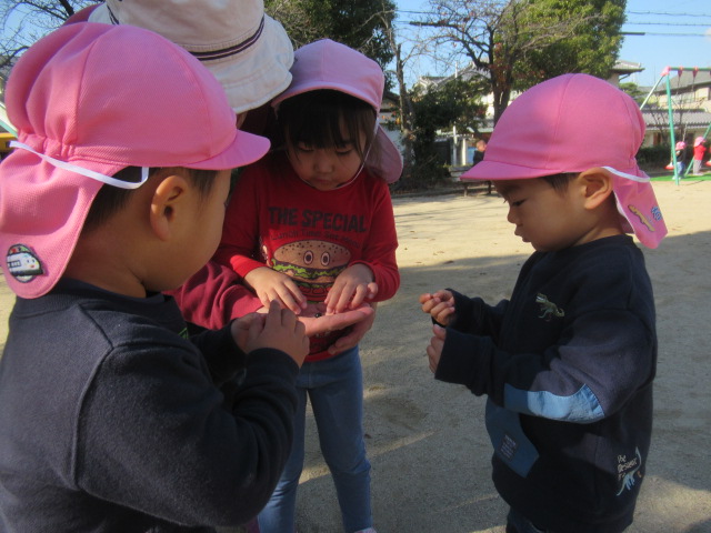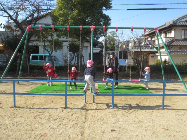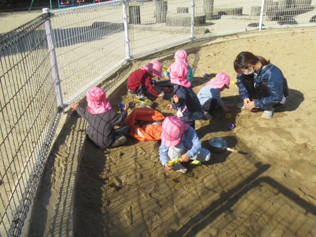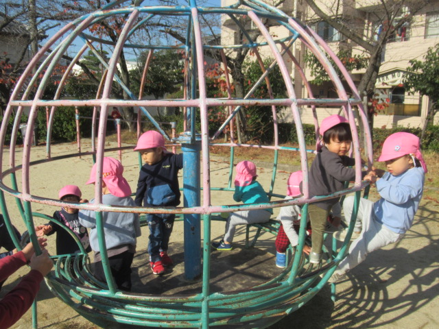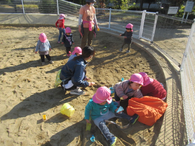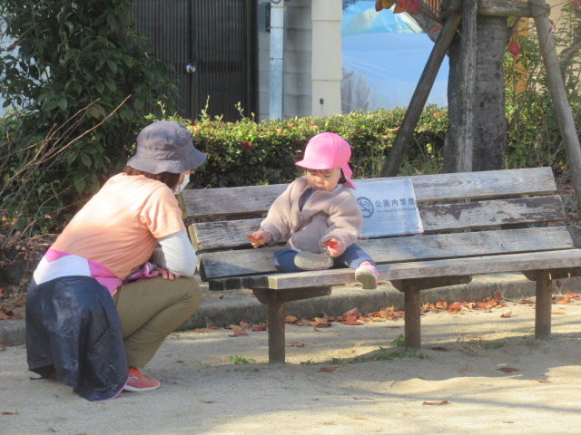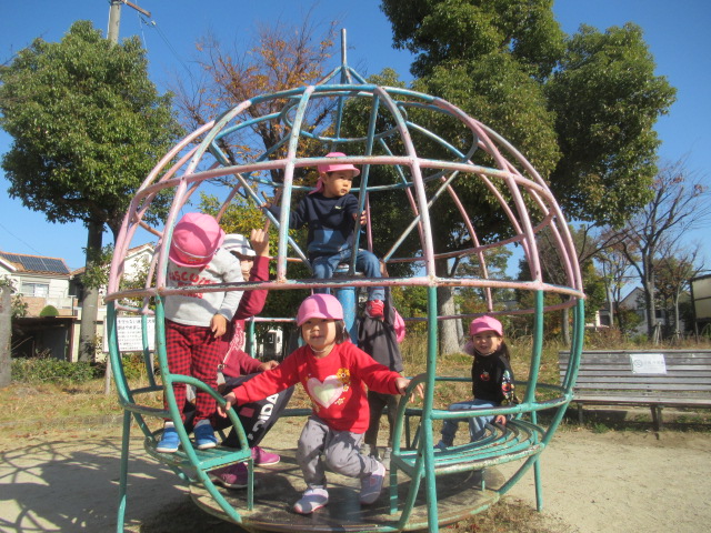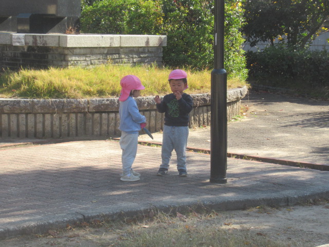 今日も公園に着くとぽっかぽか^_^ 着てきたジャンパーも脱いで遊びました!動きやすくなるからか!?子どもたちもハァーと一息ついてスッキリ顔^_^ まだまだ木に実っているどんぐりが落ちてないか?確認に行く子や、落ちてるどんぐりを見つけると「みんなー!!!見てみてー!」とあちこち走り回って見せてくれたり!喜びを共有しようとする姿も沢山見られる様になってきました^_^ 気球の遊具では動物園に行こう!と運転手の行きたい所に行って「ヒョウおるかな?」「ネコチャンおるかな?」「ネコはおらんわ」と会話も面白く賑やかなごっこ遊びが最後まで続いていて楽しかったですよ。砂場では黙々とゼザート作りなどを作って「どうぞ!」と食べてもらっては喜んでいました^_^