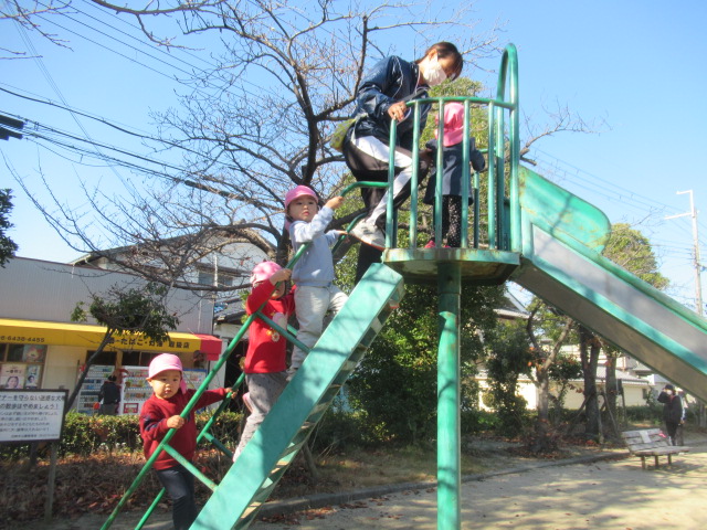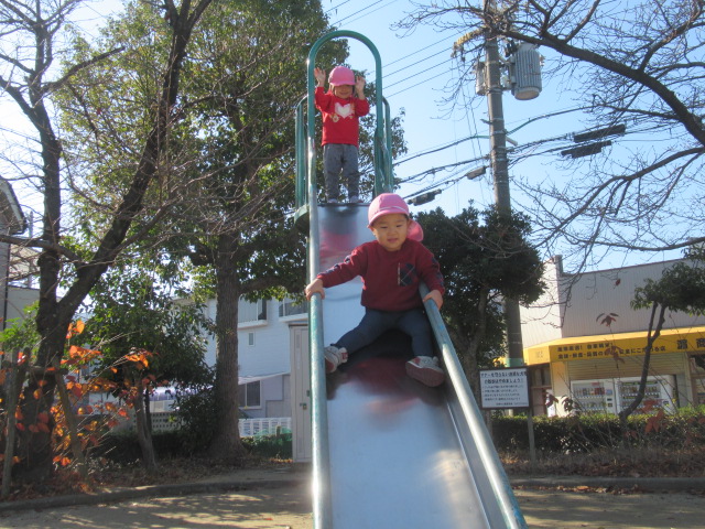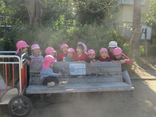 今日も雲ひとつない良いお天気。元気に出発!おしゃべりしながら、先頭の子どもたちは「車きたよー!」「ゴミ収集きたなぁー!」とみんなにも声を掛けてくれたり、はりきっていましたよ。