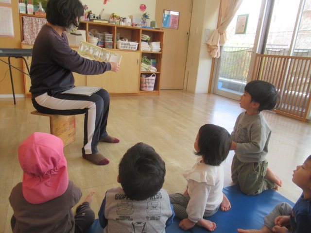 「もりのふゆじたく」という絵本を読みました。森の動物たちが、冬支度のために木の実を集めていたけれど、なかなか集められない動物さんに優しいタヌキさんが集めた木の実を配っているとすっかりなくなって、、、。というお話です。みんなもどんどん木の実がなくなる様子を心配そうに見ていました。