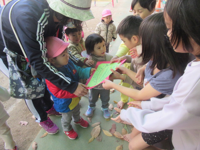 「みんなあったよー!!」と教えてくれ、駆け寄って一人一人持ってきた木の実を届ける事が出来ました。