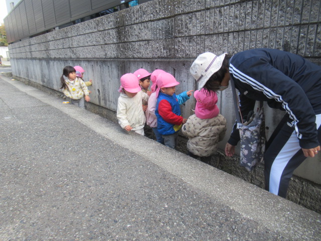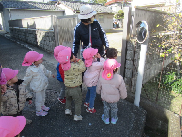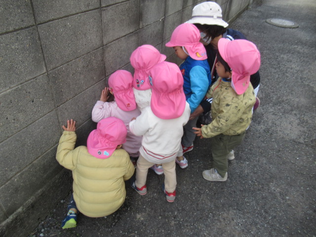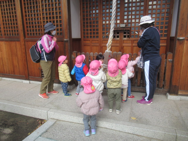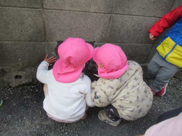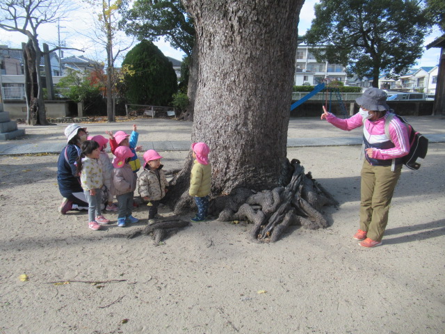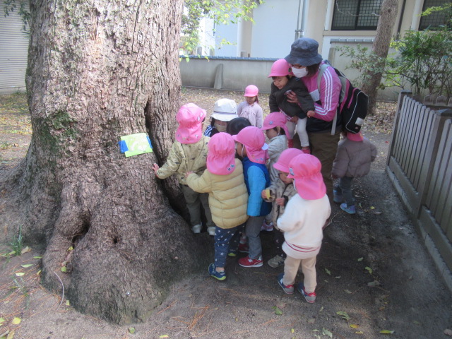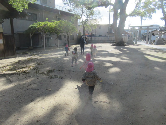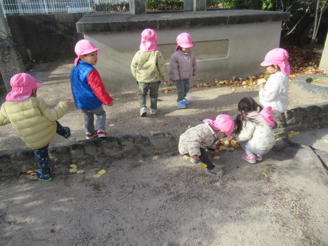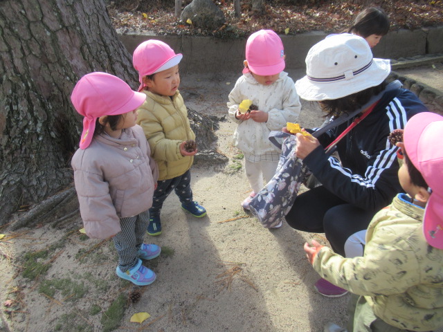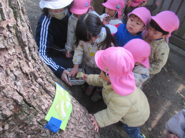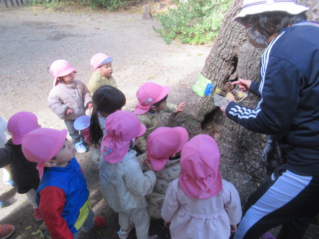 絵本に出てきた優しいタヌキさん。みんなに配って木の実が無くなっていたから木の実を届けに行こう!と出掛けました。途中覗き穴に寄ってみるとそこは素敵なクリスマスの飾りが飾られていて、とってもホッコリしました。その後も「どこかなー?」「この穴ちゃう?」「小さ過ぎやん!」と夢中になって探していると神社の中へ!入り口にも木の実がたくさんあって「きっとここだ!」と手にいっぱい木の実を持って探していると、タヌキさんの家発見!!
