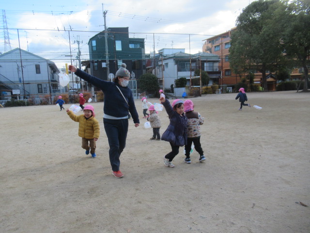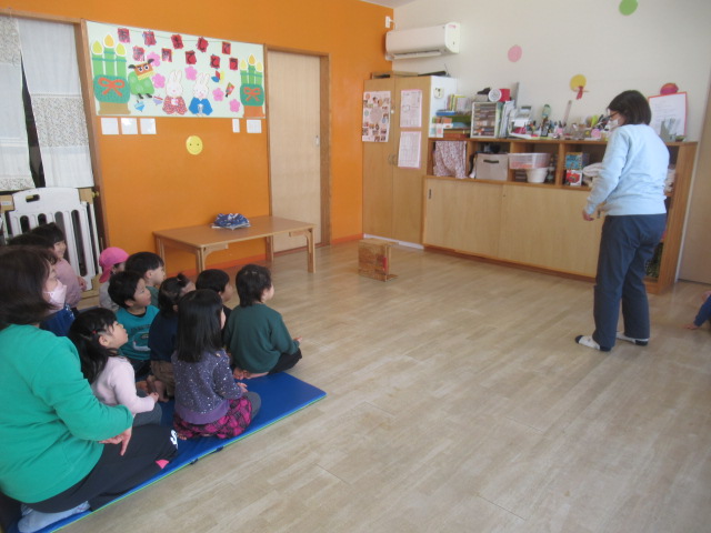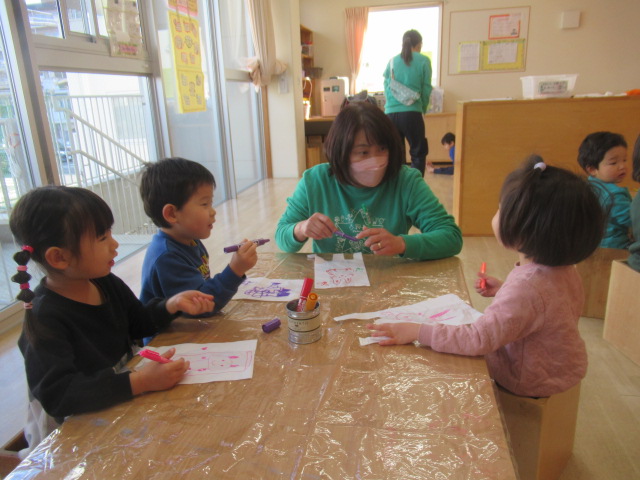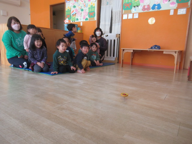 年末年始のお休みが明けて、元気に登園してきてくれました。お休み中、お餅やお雑煮を食べたことなど心に残っていることをいろいろとお話ししてくれました。お正月にちなんで、こま回しを披露しました。回るととても喜んでくれた子どもたちです。