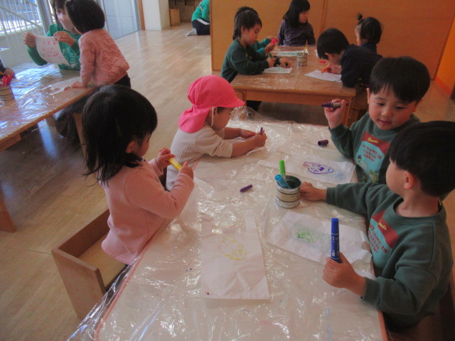 買い物袋を使って凧作りをしました。袋に自由に絵を描いてもらいます。お餅を描いたり、ウサギを描いたり、好きな動物を描いたり楽しい絵がたくさんでした。紐を付けて完成です。