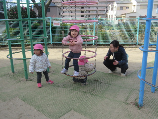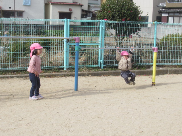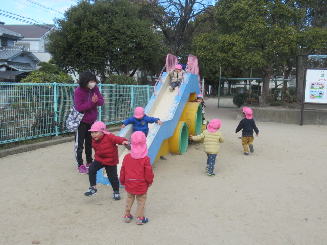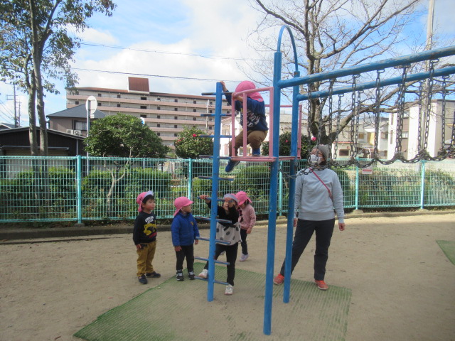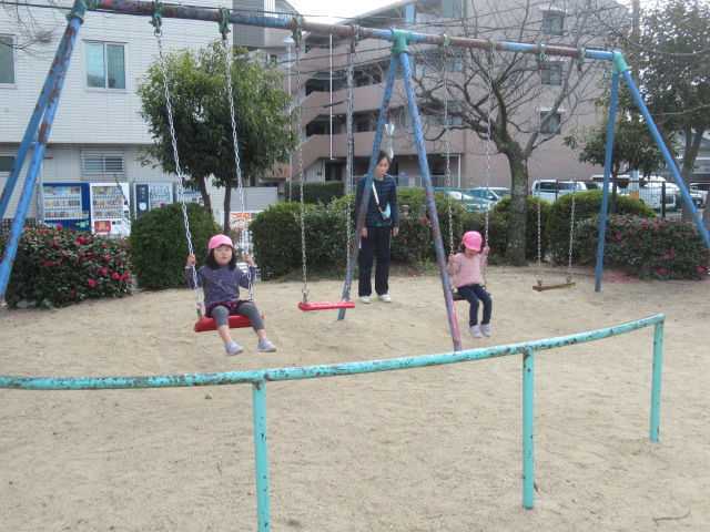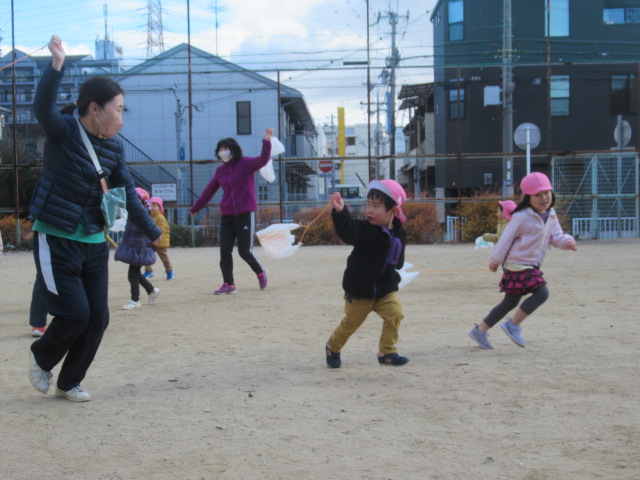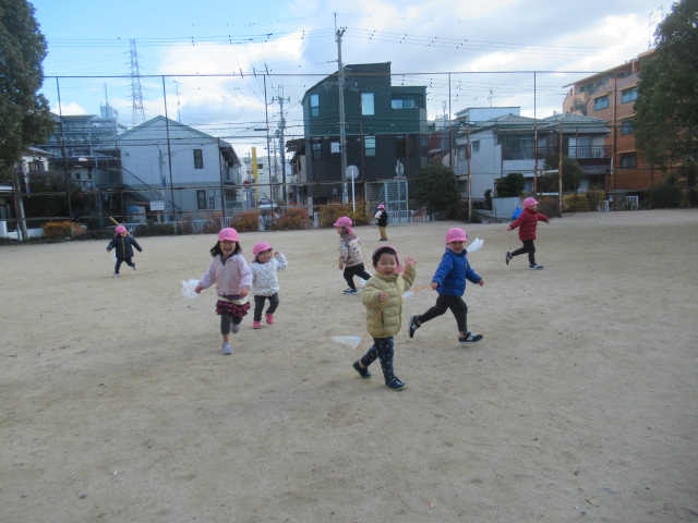 近くのグランドへ早速、凧をもって遊びに行きました。走って凧上げしていると背中が熱くなってきました。楽しんだ後は公園の遊具で遊びました。