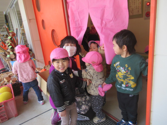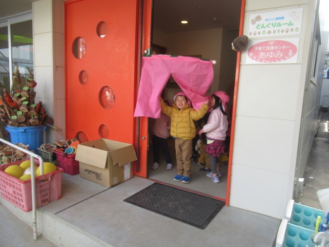 外から帰ると、子育て支援センターの渡瀬さんがいつもタライにお湯を入れてくれています。子どもたちが足を洗うためです。今日は入り口に暖簾まで用意してくれていて子どもたちも大喜びでした。