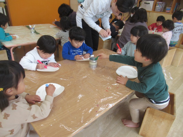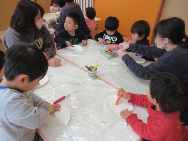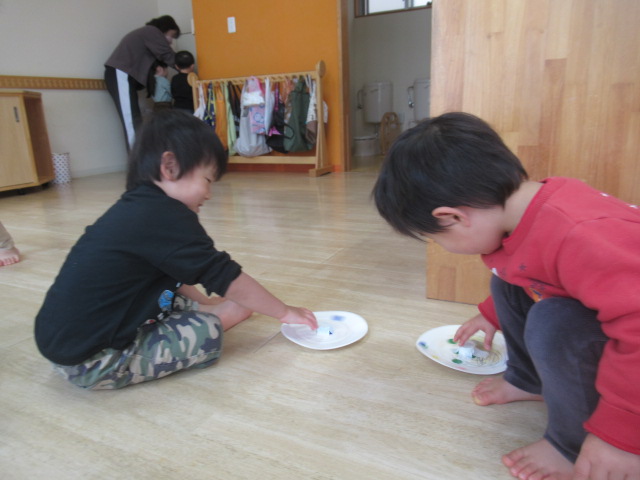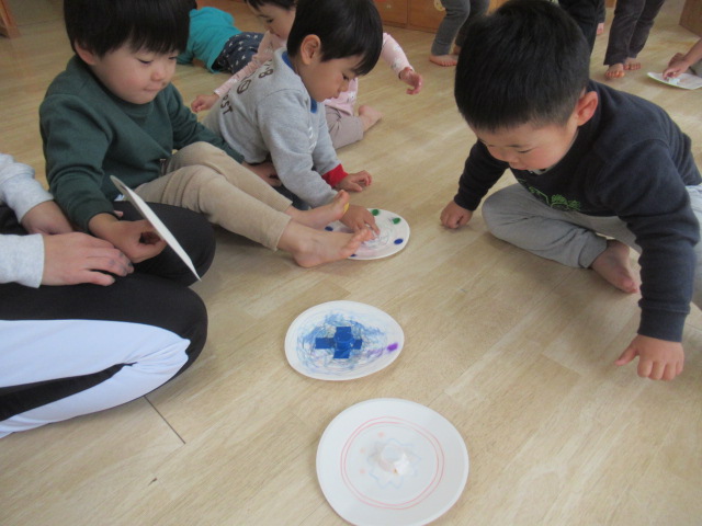 紙皿でコマを作りました。ペンでお絵描きをして、シールを貼って飾り付けをして、仕上げにペットボトルのキャップを付けたら出来上がりです。出来たらみんなで回してみました。指先を上手く使ってくるくる回しますが、最初はなかなか回らなくても、お友達の回っているのをじっと見ているうちに回せるようになったり、どっちが長く回せるかな?と回しあいっこしたり、自分で作ったコマを楽しんで回していました。