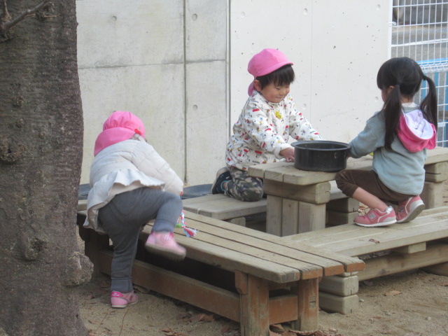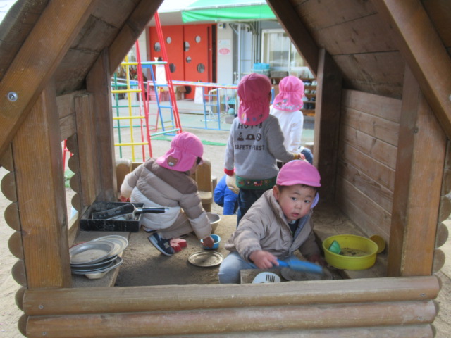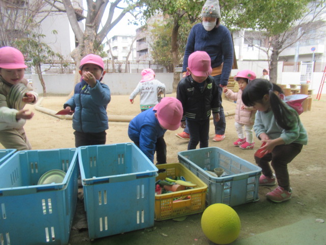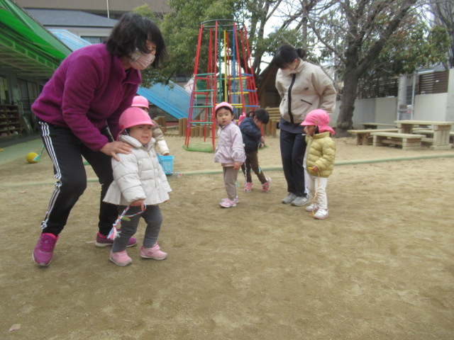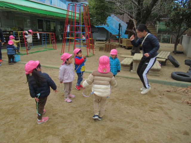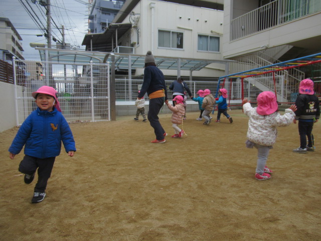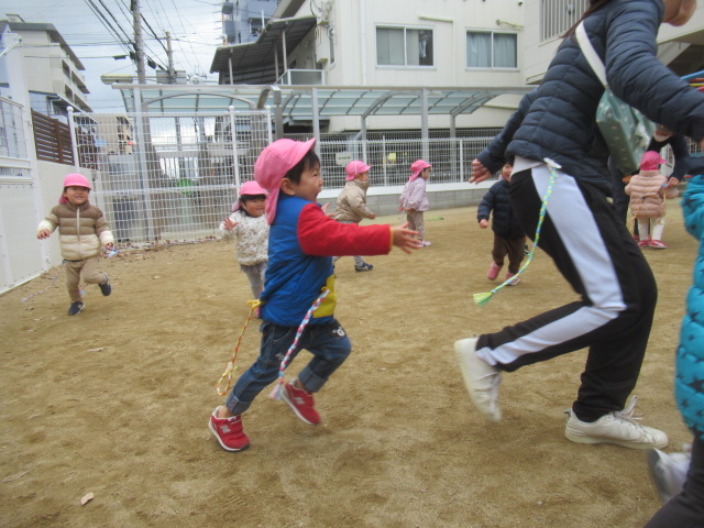 寒いときこそ走って体を暖めよう!と、ジャンパーを着て園庭でしっぽ取りをしました。取られるのは嫌でも、取るのはみんな大好きで、まてまてー!とお友達や保育士を追いかけました。2回ほど楽しんだら熱くなってジャンパーを脱いで遊ぶ姿もあり、しっかり体は暖まったようでした😊それから少しだけ園庭で遊びました。