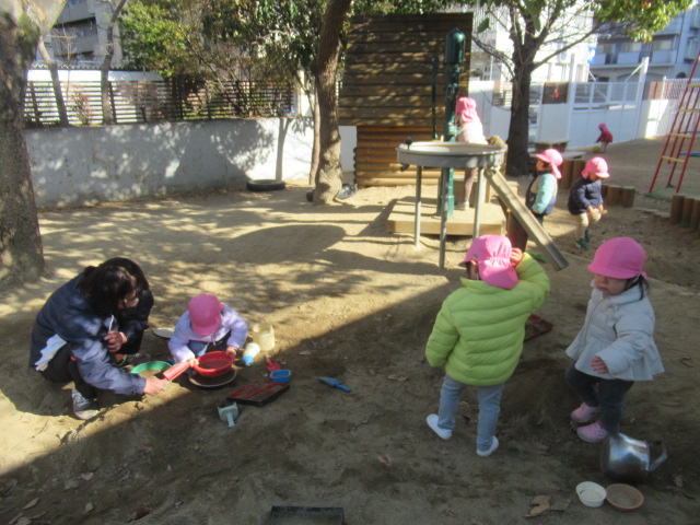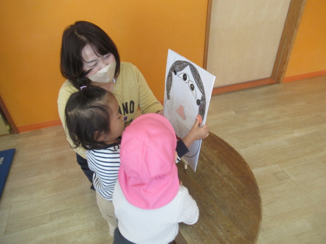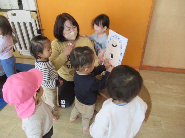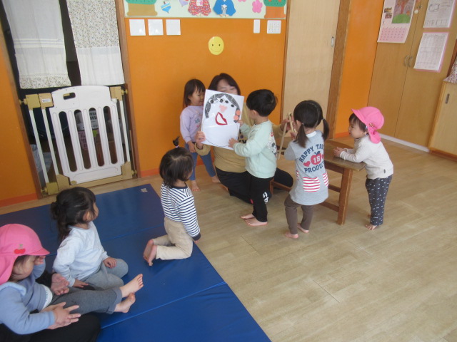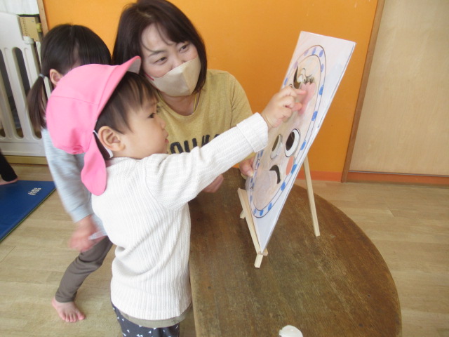 鏡開きにちなんで絵本『おもちのきもち』を読みました。そしてみんなが元気モリモリで過ごせます様に!楽しく笑って過ごせます様に!と『福笑い』をしました。”おかめ”と”ひょっとこ”の絵に、目はこっち?口はここかな?と顔のパーツを貼っていくと…あれれ?面白いお顔の出来上がり。みんなでワッハッハと笑顔になりましたよ♪