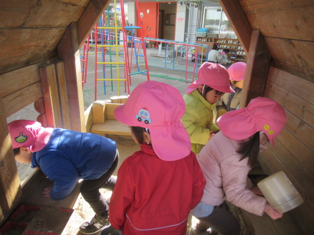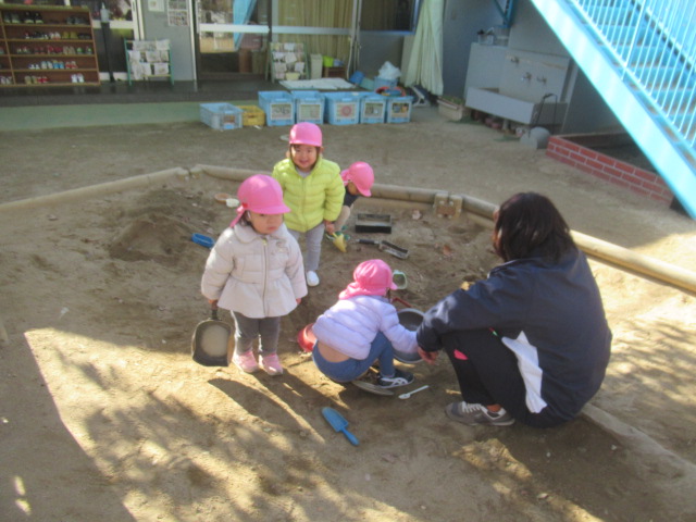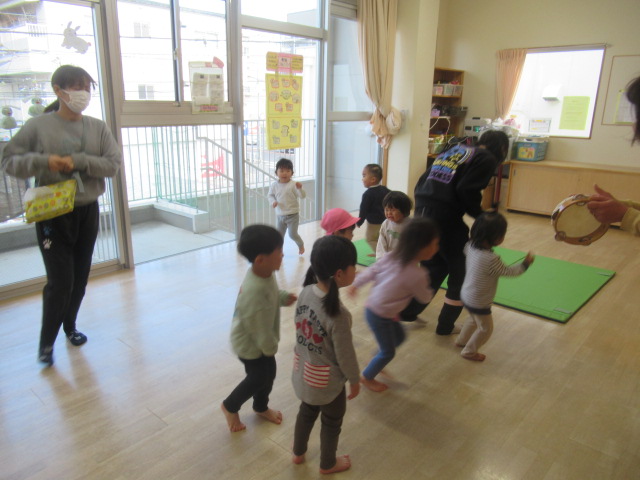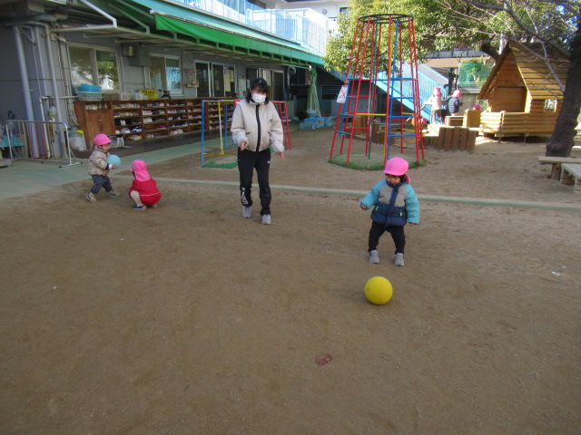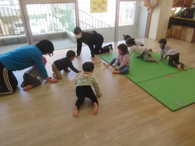 青色マットと緑色マットの間をハイハイやカエルさんになりながら移動し、笛の合図でどちらにするか決めて保育士の転がしたサイコロの色の方に座っている方が勝ちというルールのある遊びをしました。勝ったチームは万歳で大喜び♪ 身体もポカポカ暖まり園庭に出て砂場やボール遊びを楽しみました。