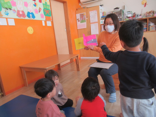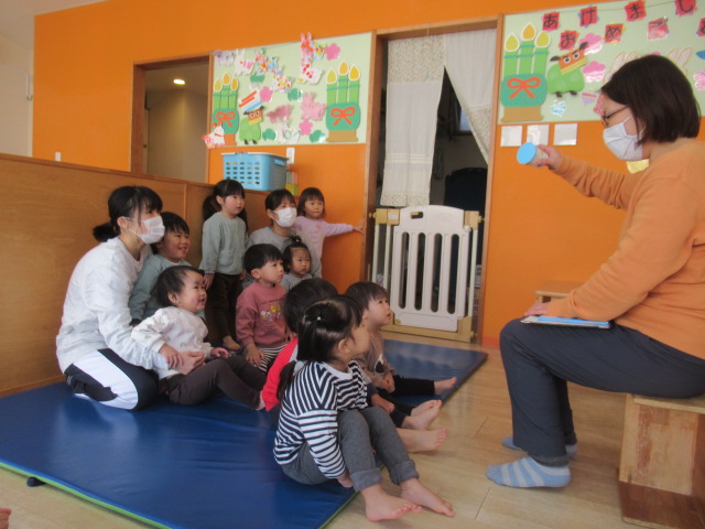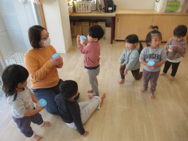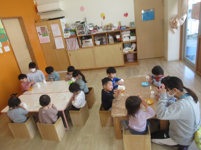 秋に公園でたくさん拾ったどんぐりを使って紙コップのマラカスを作りました。シールを貼るにもそれぞれこだわりがあり、見ていて楽しかったです。少しずらして重ねて貼ってみたり、一列に並べて貼ってみたり色々な貼り方がありました。カシャカシャいい音がなりました。みんなで歌をうたっていい音を響かせました。
