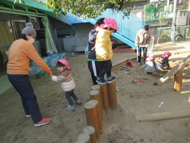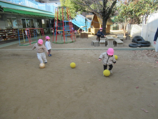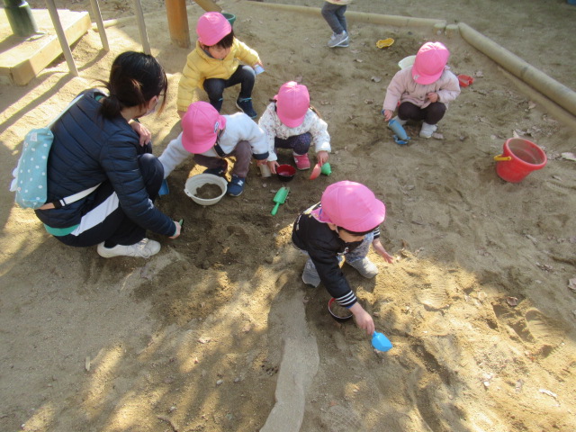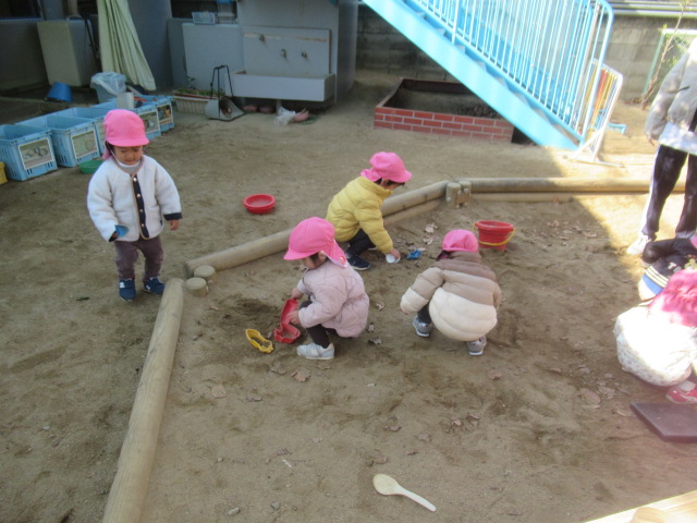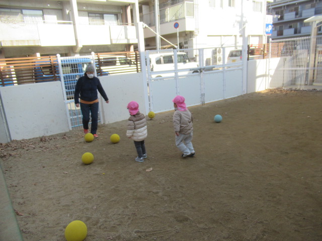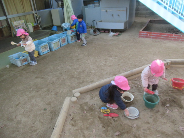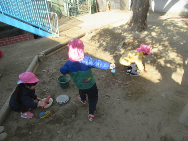 ボールやお砂場であそびました。ボール遊びはカゴを使ってサッカーのように遊んでみたり、投げて、カゴに入るとヤッターと喜んだり、お友だちと一緒に遊ぶからこそ楽しいものになってきているなと感じました。お砂場でおままごとをしているお友だちは、できたお料理をテーブルに並べてお友だちや保育士と一緒に食べたりやりとりを楽しんでいました。