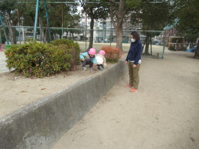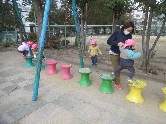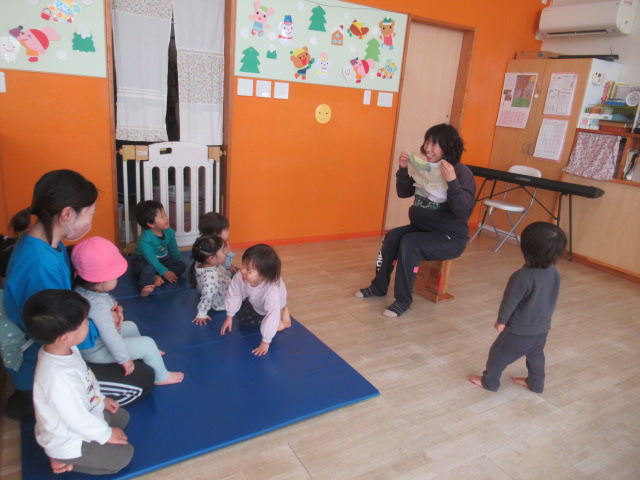 かくれんぼしている動物のあてっこをして、その後みんなの名前を呼びました。最近お友だちの名前を覚えて呼び合う姿が増え、名前を呼ばれたお友だちを「ここにおるよー!」と教えてくれたり仲間意識が出てきて嬉しいです。