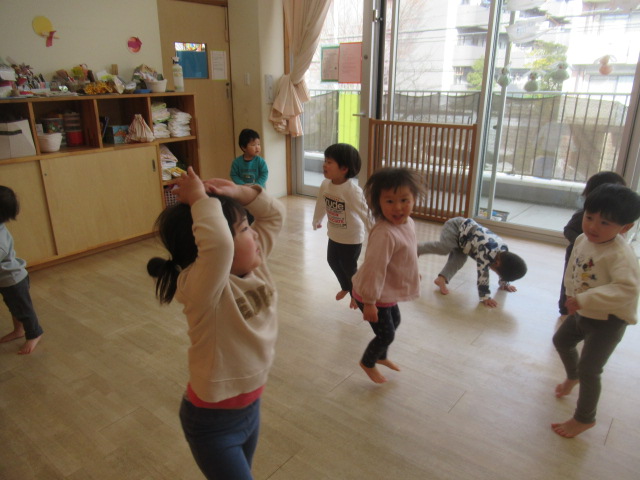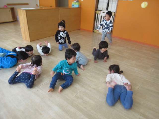 リズムに合わせて走ったり得意な亀(うつ伏せになって背中をそらして足を持つポーズ)をしたり、ハイシーや、ウサギなどなど楽しみました。なんでも真似っこを楽しんだり、苦手と感じる部分は離れて見ていたり、コレなら!と思うのは出てきたり、様々な姿で参加してくれています。