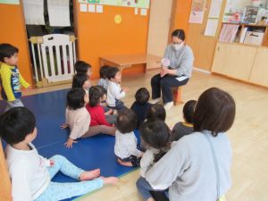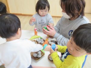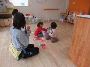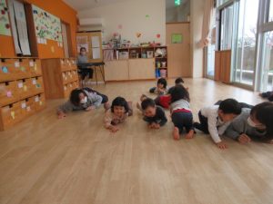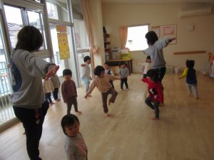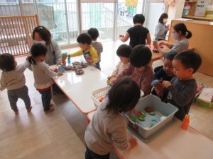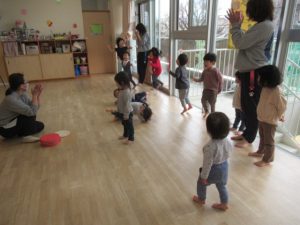 お片付けだよーと声をかけると、最近は必ずと言っていい程、「ヤダ~!」と子どもたちが大合唱。お友だちとの仲が深まってきたことや、安心して過ごせるようになっているのだなと嬉しいです。
